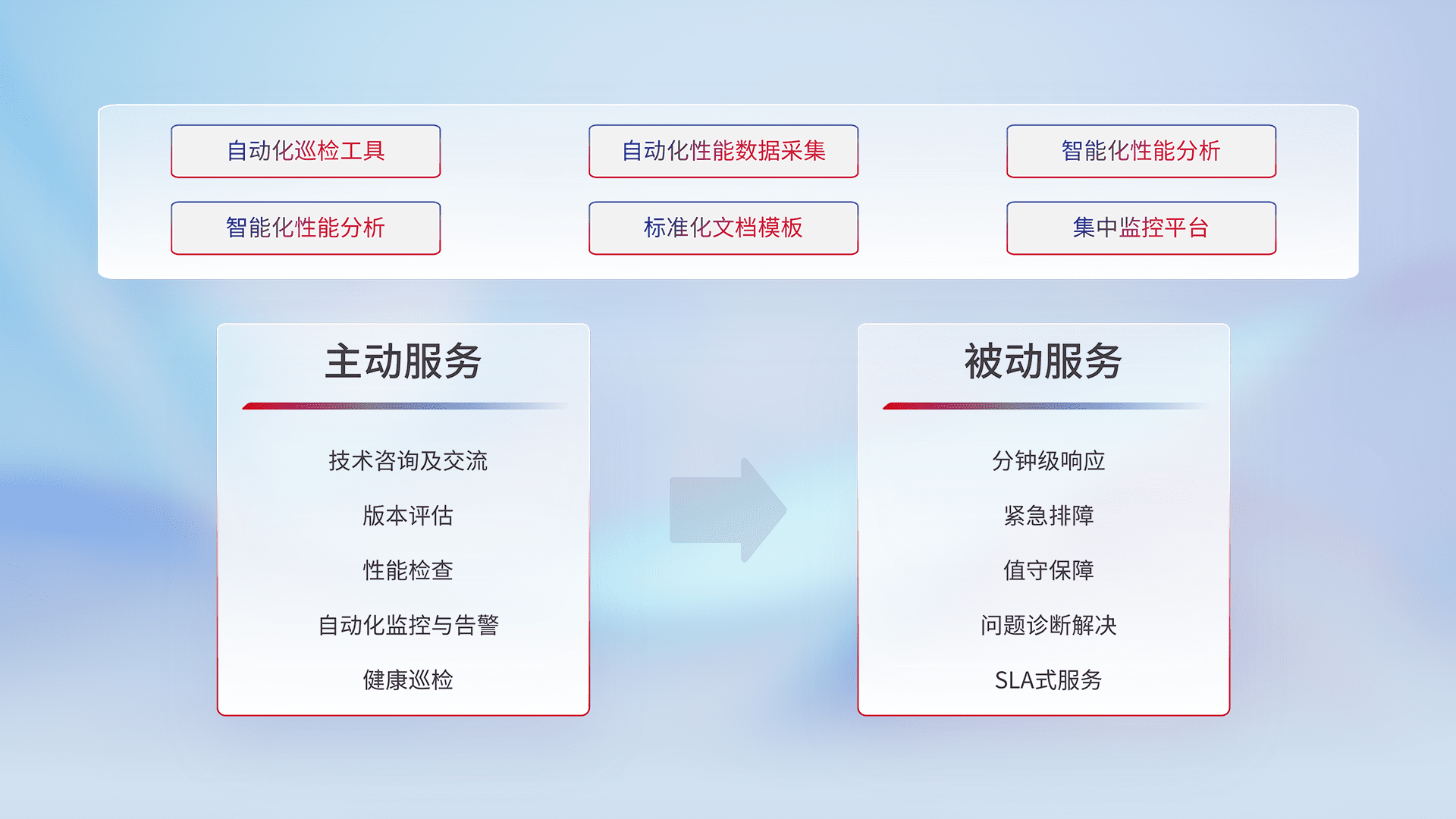 智能化工具和标准化文档,,,,保障服务质量,,,,提供主动服务(包含技术咨询、、、、版本评估、、、、性能检查、、、、自动化监控与告警、、、、健康巡检)和被动服务包含(分钟级响应、、、、紧急排障、、值守保障、、、、问题诊断解决、、、、SLA服务)。。