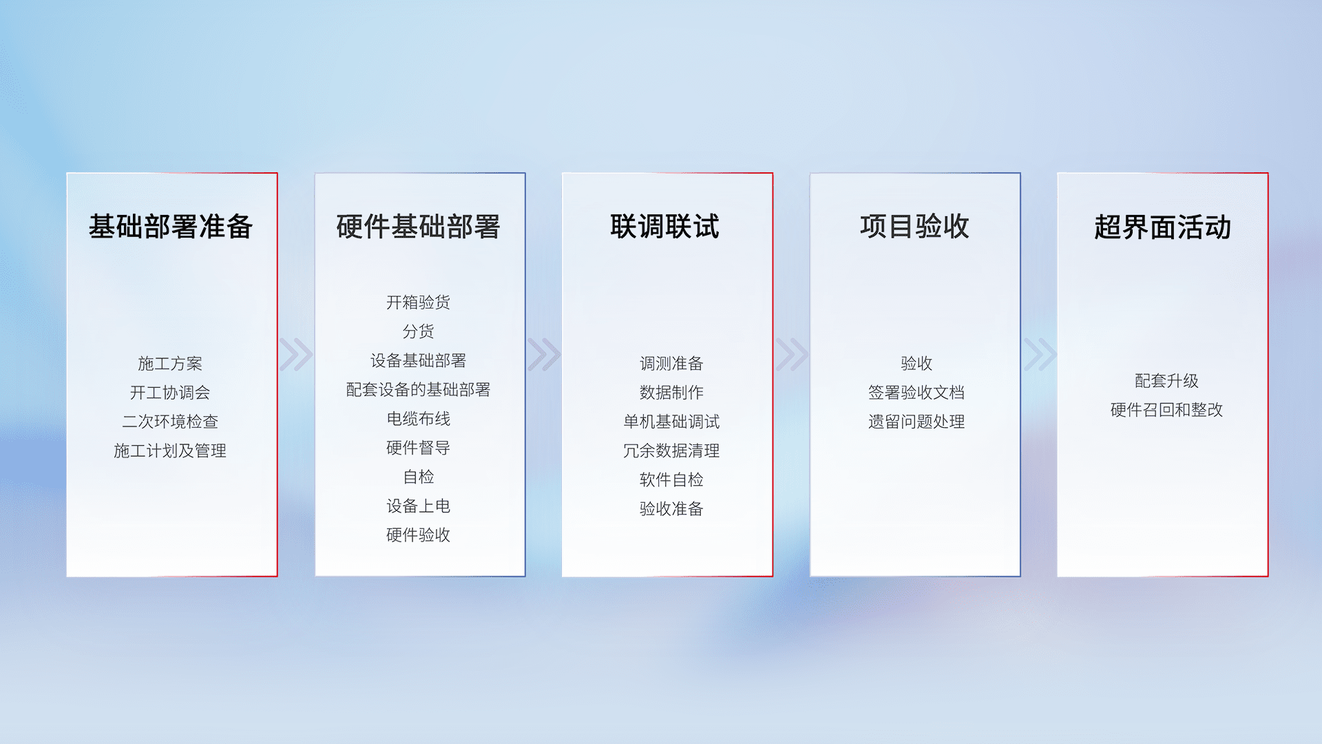 从基础部署准备、、、、硬件基础部署、、联调联试、、、项目验收、、、越界面活动的全过程可追溯,,,保证施工质量和进度。。